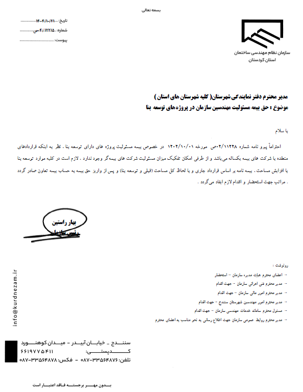 اخبارحق بيمه مسئوليت مهندسين سازمان در پروژه هاي توسعه بنا 4 بهمن 1404 ارسال شده توسط هورامان بهرامی 04 بهمن حق بيمه مسئوليت مهندسين سازمان در پروژه هاي توسعه بنا Print 🖨 PDF 📄 eBook 📱