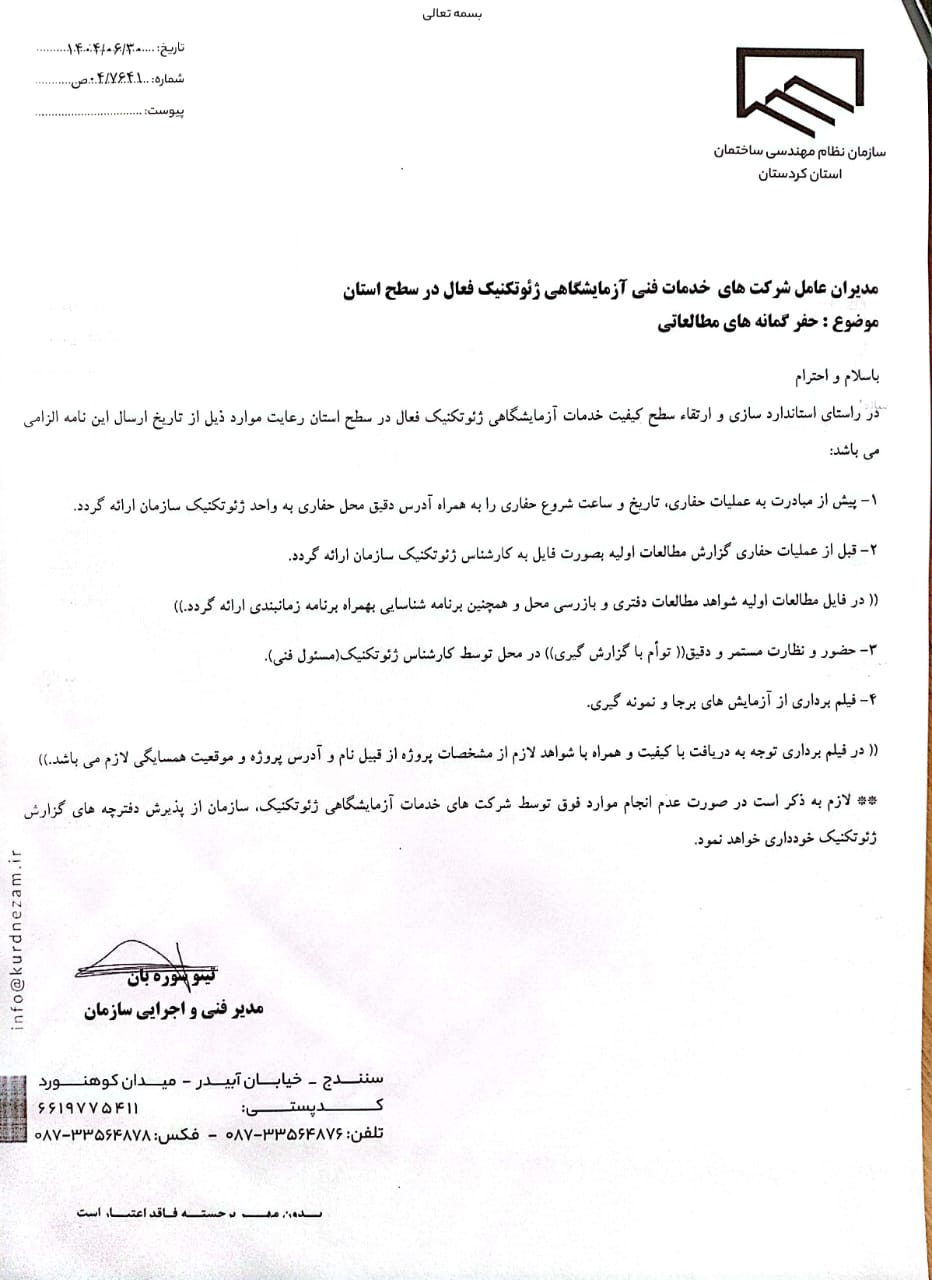 قابل توجه مديران عامل شركت‌هاي خدمات فنی آزمايشگاهي ژئوتكنيك فعال در سطح استان كردستان