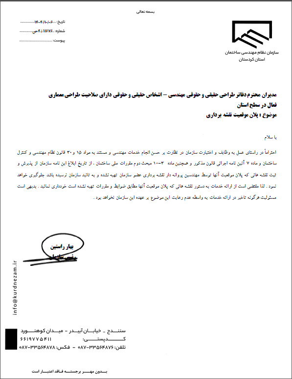 مکاتبه رییس سازمان با مديران دفاتر طراحي حقيقي و حقوقي مهندسي – اشخاص حقيقي و حقوقي داراي صلاحيت طراحي معماري فعال در سطح استان