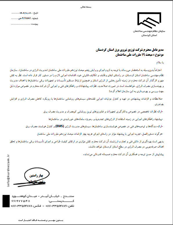 مکاتبه رییس سازمان با مديرعامل شركت توزيع نيروي برق استان كردستان/مبحث 19 مقررات ملي ساختمان