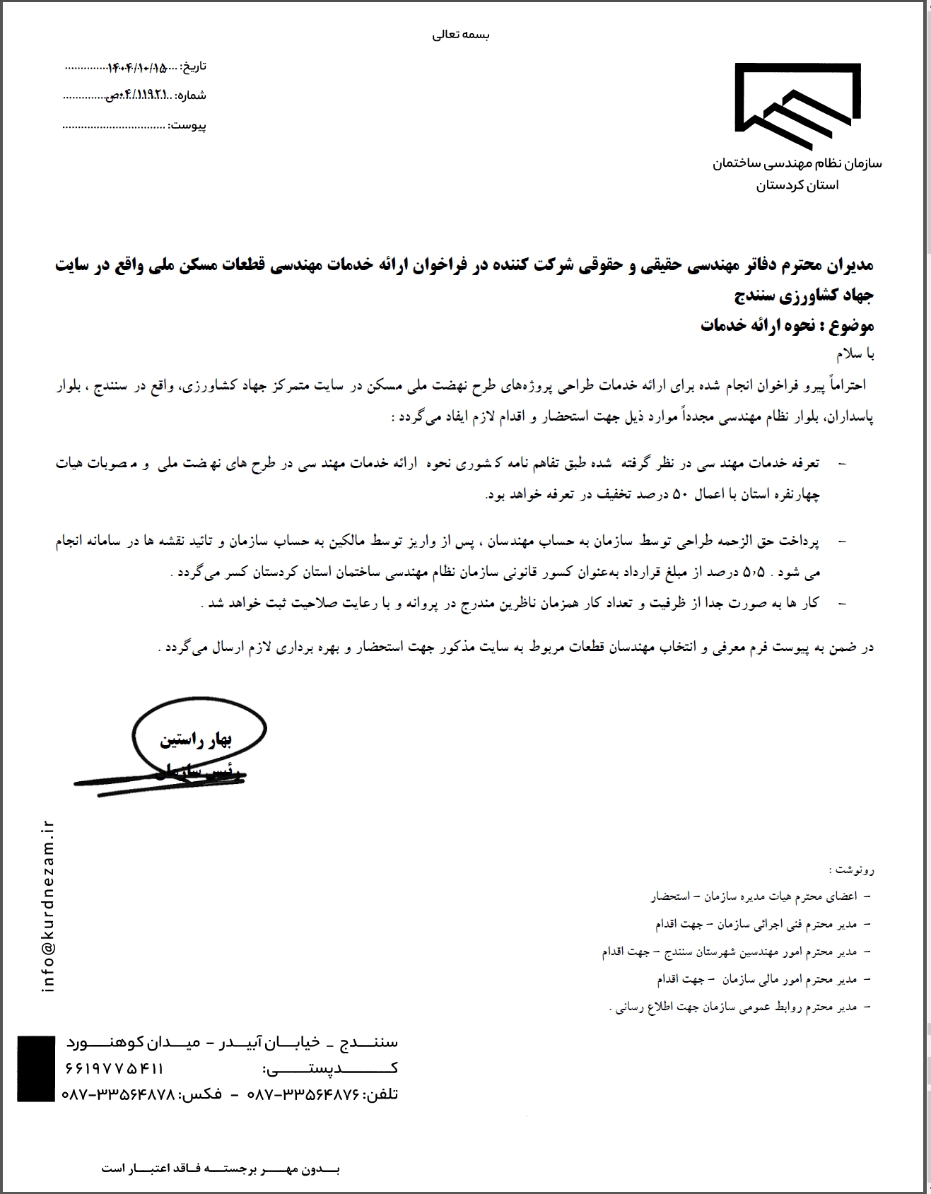 قابل توجه مديران دفاتر مهندسي حقيقي و حقوقي شركت كننده در فراخوان ارائه خدمات مهندسي قطعات مسكن ملي واقع در سايت جهاد كشاورزي سنندج