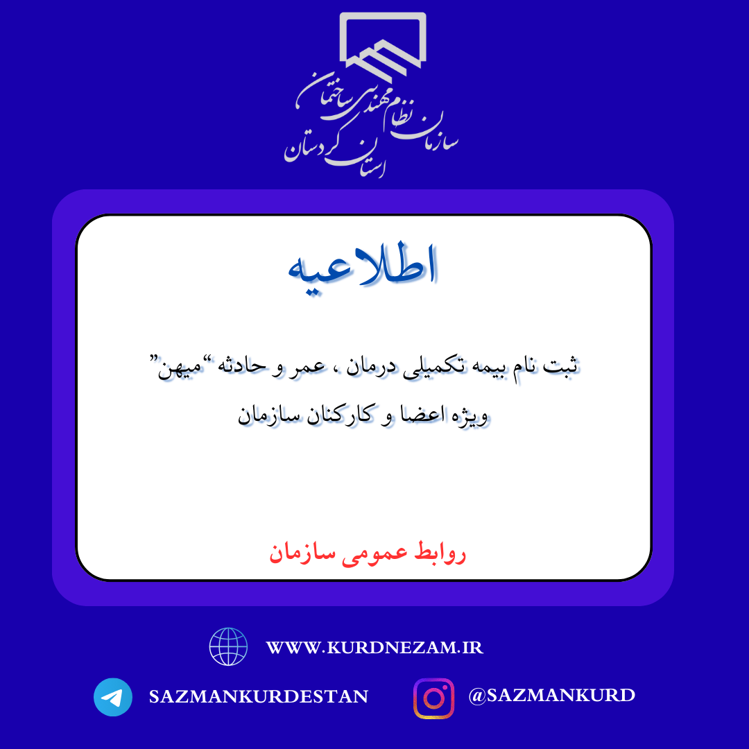 اطلاعیه ثبت نام بیمه تکمیلی درمان ، عمر و حادثه “میهن” ویژه اعضا و کارکنان سازمان نظام مهندسی کردستان