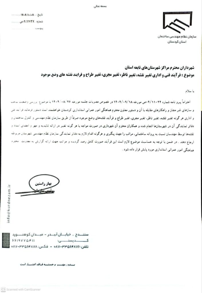 نامه رئیس سازمان به شهرداران محترم مراکز شهرستانهای تابعه استان/ فرایند فنی و اداری تغییر نقشه، تغییر ناظر، تغییر مجری، تغییر طراح و فرایند نقشههای وضع موجود