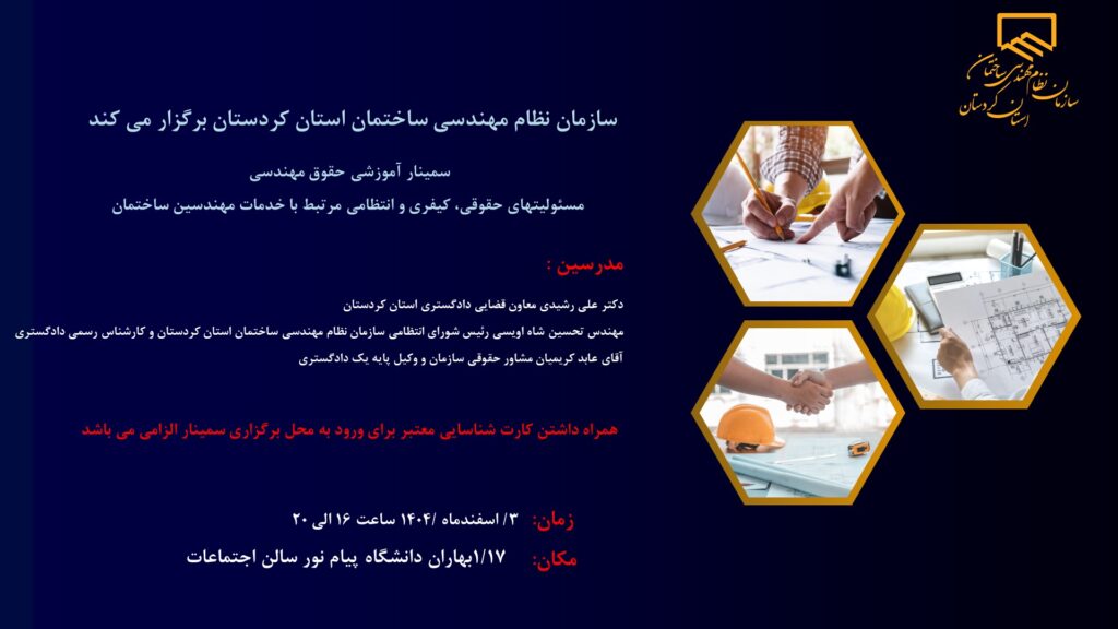 27 بهمن اخبار سمینار آموزشی حقوق مهندسی مسئولیتهای حقوقی، کیفری و انتظامی مرتبط با خدمات مهندسین ساختمان 27 بهمن 1404 توسط هورامان بهرامی 0 نظرات سمینار آموزشی حقوق مهندسیمسئولیتهای حقوقی، کیفری و انتظامی مرتبط با خدمات مهندسین ساختمان زمان 3/ اسفندماه /1404 ساعت...ادامه خواندن