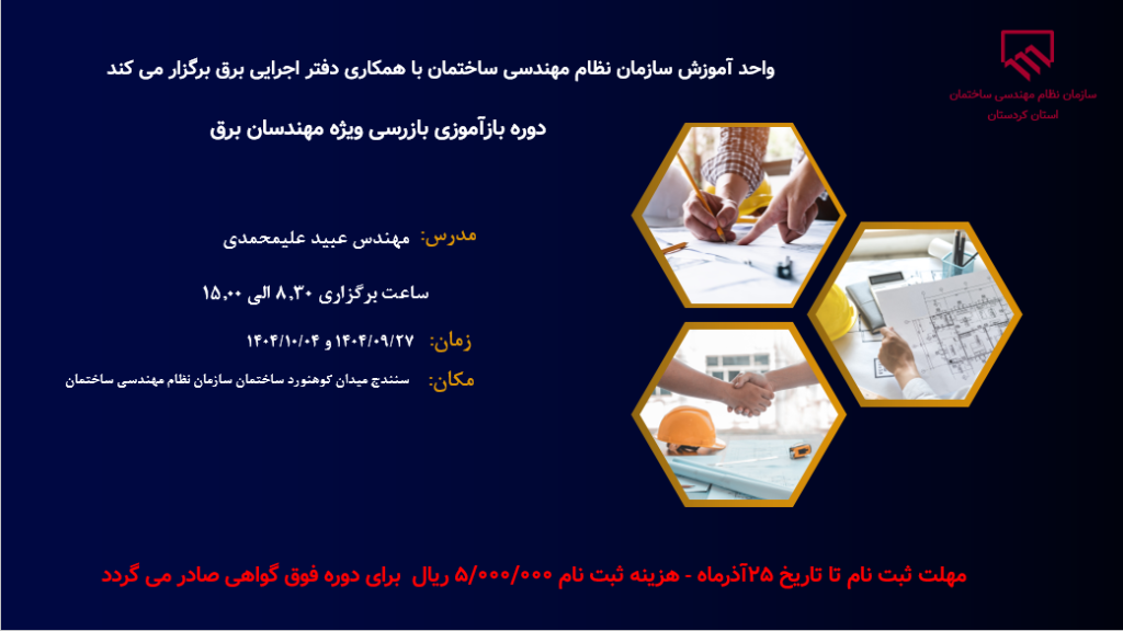 18 آذر اخبار, اطلاعیه های آموزش دوره بازآموزی بازرسی برق 18 آذر 1404 توسط هورامان بهرامی 0 نظرات قابل توجه اعضای محترم دفتر اجرایی نظارت برقبه اطلاع میرساند دوره بازآموزی بازرسی برق در تاریخهای 1407/09/27 و 1404/10/04 برگزار م...ادامه خواندن