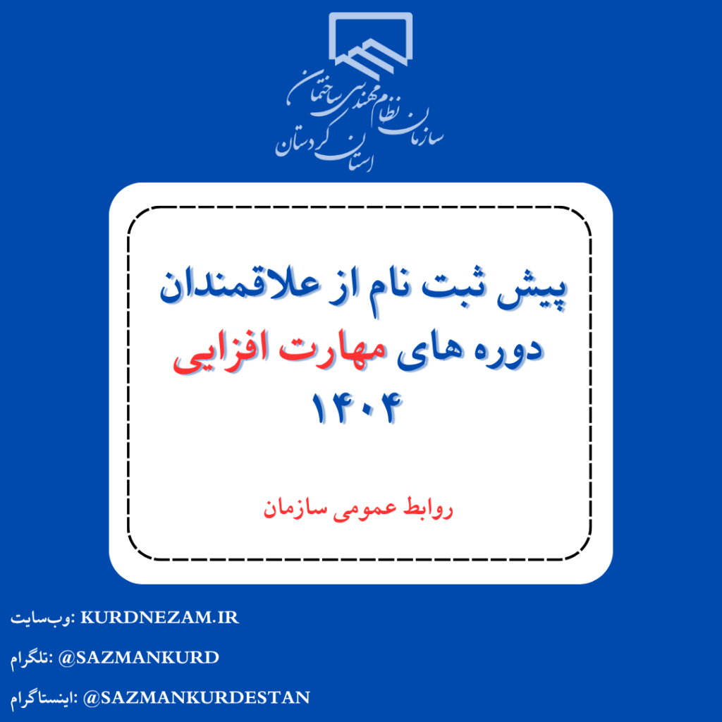 24 آبان اخبار پیش ثبت نام دوره های مهارت افزا در سال 1404 24 آبان 1404 توسط هورامان بهرامی 0 نظرات اطلاعیه مهم آموزشی🔻سازمان نظام مهندسی ساختمان استان کردستان در نظر دارد برای دوره های عنوان شده در فرم ثبت نام، اقدام به پیش ثبت نا...ادامه خواندن
